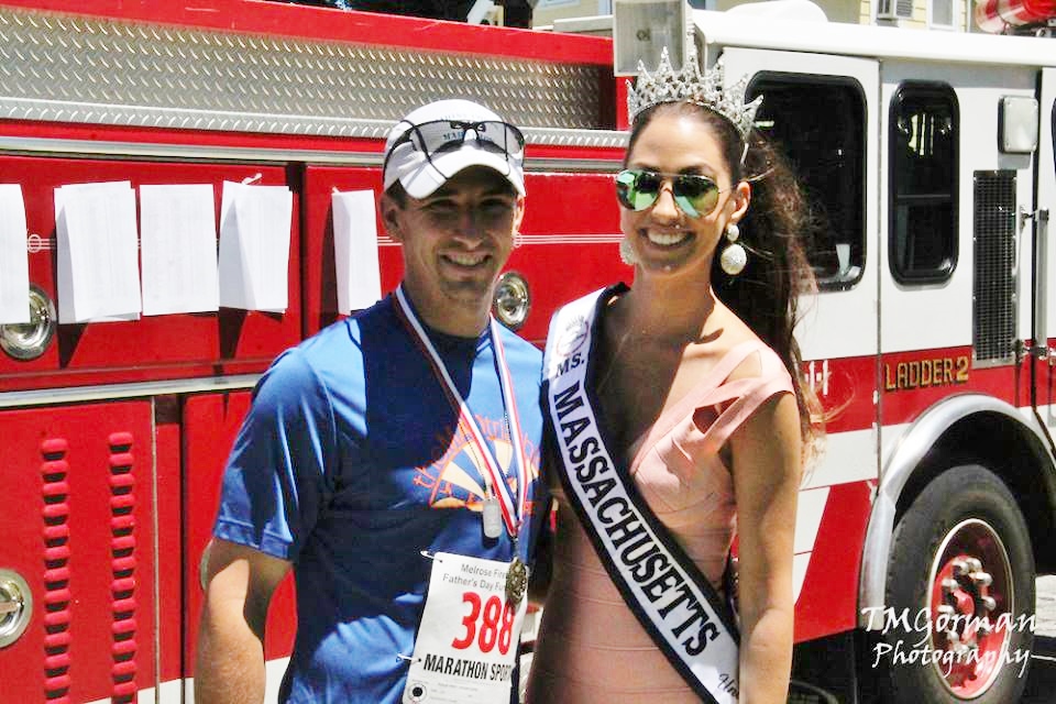 Firefighter Dan Hancock came in as the fastest male Firefighter running in the event with a time of 21.22. (Ms. Massachusettes presents Dan with the metal)